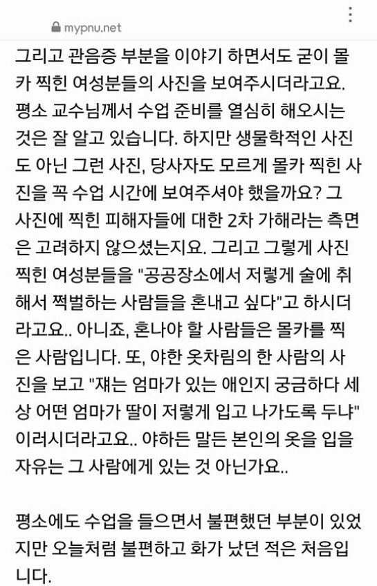 ◇ 1년이 지나도 여전히 사용되는 '몰카' 자료2016년 당시, 부산대 온라인 커뮤니티인 '마이피누'에는 "성과(성의 과학의 줄임말) 오늘 수업 저만 듣기 불편했나요?"라는 게시글이 올라왔다.