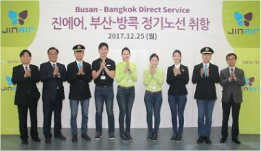 진에어는 25일 김해국제공항 국제선 청사 2층에서 고광호 진에어 영업본부장을 비롯한 부산지점 진에어 임직원들이 참석한 가운데 부산~방콕 노선 신규 취항식을 진행했다. 이날 오전에도 진에어는 부산~삿포로 노선의 취항 행사와 함께 첫 운항을 개시하며 하루에 2개의 부산발 국제선을 개설했다.