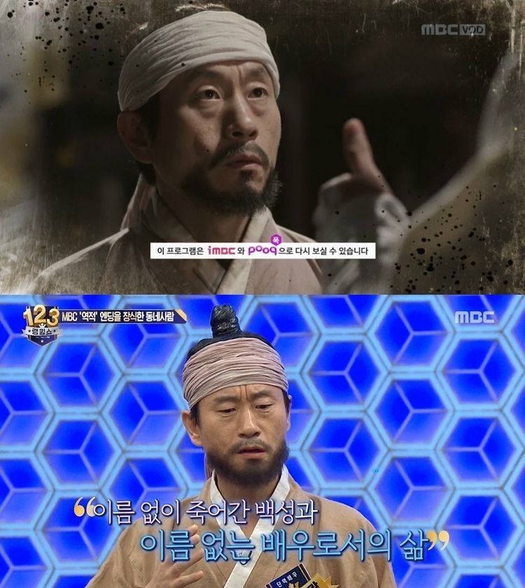 지난 4월 25일 방송된 MBC 월화특별기획 '역적'의 엔딩을 장식한 배우 최교식. 아래는 지난 8월 18일 MBC '랭킹쇼 1 2 3'에 '동네사람'이란 닉네임으로 출연한 최교식의 모습 (사진=각 방송 캡처)