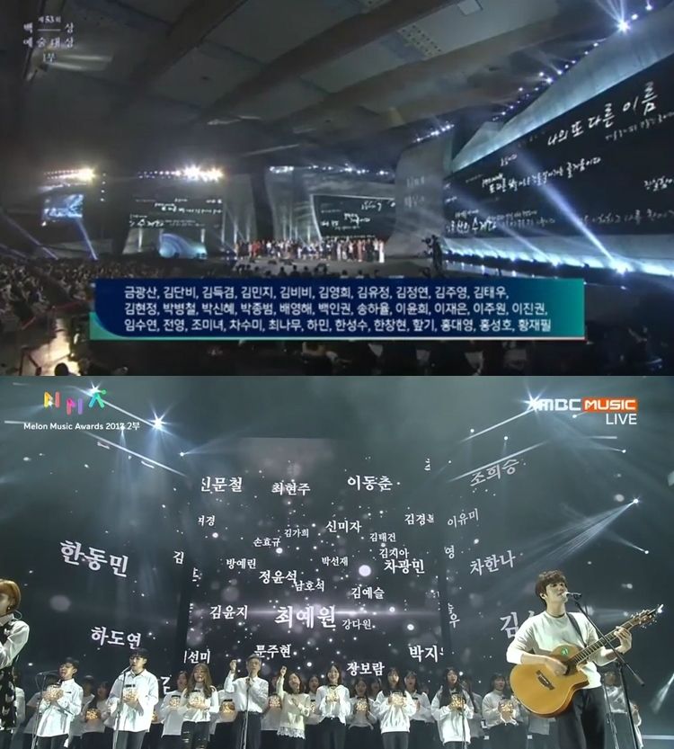 올해 열린 제53회 백상예술대상에서는 무명배우의 축하공연이, 2017 멜론 뮤직 어워드에서는 아이유와 함께 부른 '이름에게' 특별 공연이 무대에 올랐다. (사진=각 방송 캡처)