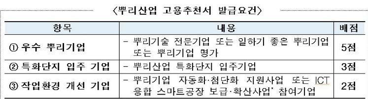 산업통상자원부는 점수제 시행에 맞춰 고용추천서 발급기준을 마련해 우수 뿌리기업 5점,특화단지 입주 기업 3점, 작업환경 개선 기업 2점을 부여키로 했다.
