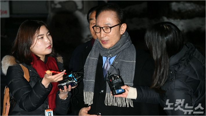 이명박 전 대통령이 12월 18일 오후 서울 강남의 한 식당에서 친이(親이명박)계 출신 전·현직 의원들과 만찬 회동 전 취재진의 질의에 답하고 있다. (사진=이한형 기자)