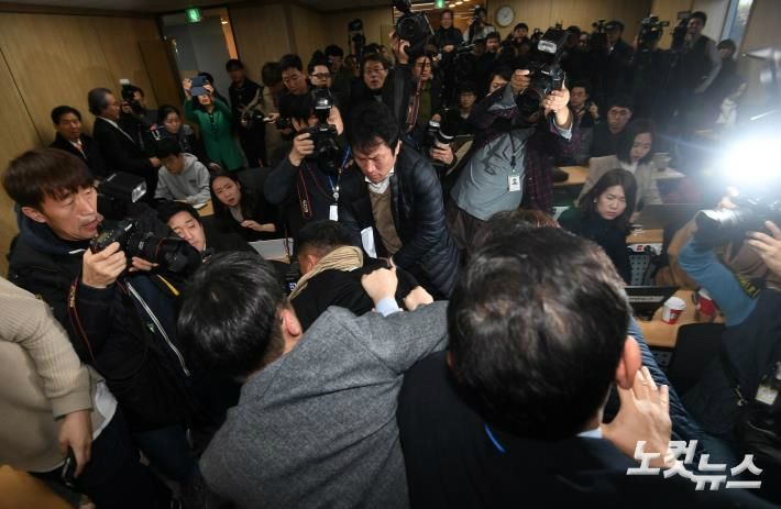 31일 오전 서울 여의도 국민의당 중앙당사에서 열린 안철수 당대표 재신임 전당원 투표 결과 발표 도중 한 반대파 당원이 회견장을 난입해 항의를 하다 직원들에게 끌려나가고 있다. (사진=이한형 기자)