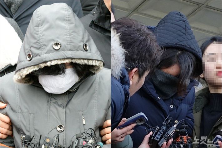 숨진 준희(5) 양의 친부 고모(36.사진왼쪽) 씨와 내연녀 이모(35.) 씨가 취재진의 질문에 고개를 숙인 채 답을 하지 않고 있다. (사진=김민성.임상훈 기자)