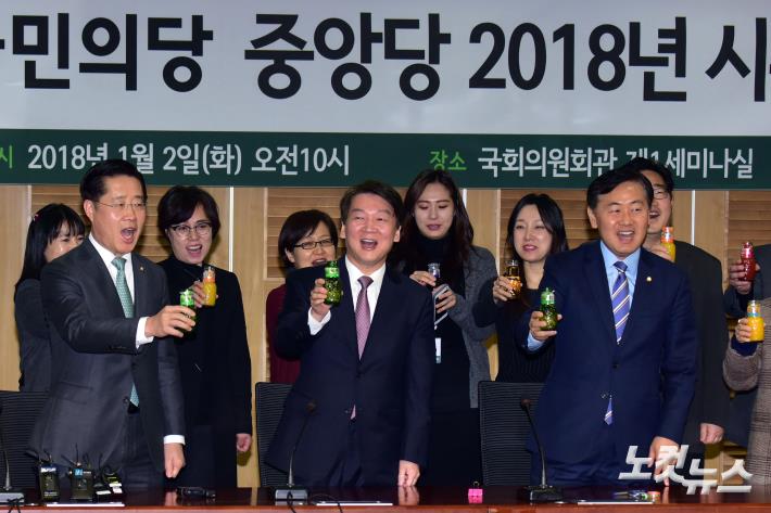 국민의당 안철수 대표가 2일 오전 국회 의원회관에서 열린 중앙당 2018년 시무식에서 건배사로 '국민의당 가즈아'를 외치고 있다.