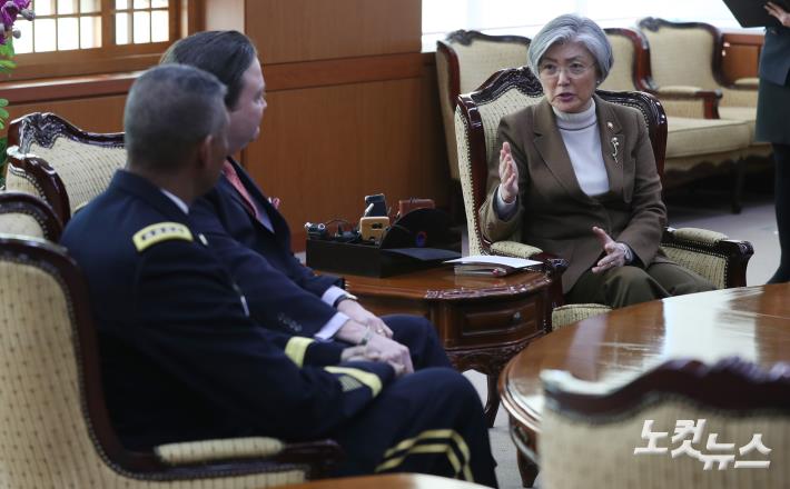 강경화 외교부 장관이 4일 오전 서울 도렴동 외교부청사에서 마크 내퍼 주한미대사대리와 빈센트 브룩스 주한미군사령관(왼쪽)을 접견하고 있다.