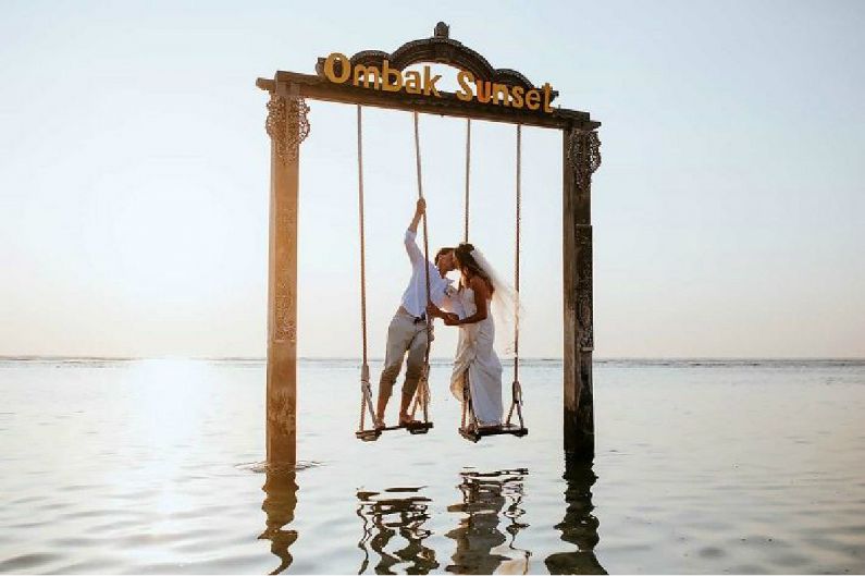 옴박 선셋 리조트 앞 해변에 자리한 선셋 그네는 길리 트라왕안 섬의 낭만을 한 장의 사진에 담을 수 있는 포토 존이다. (사진=허니문리조트 제공)