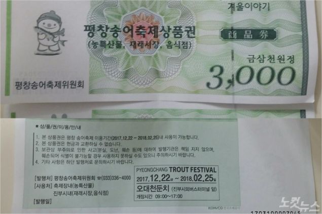 하지만 축제장에서 지급하고 있는 3000원 상당의 '평창송어축제 상품권'의 사용처가 분명하지 않아 관광객들의 불만을 사는 것은 물론 축제 이미지까지 실추시키고 있다.