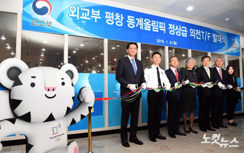 8일 오전 서울 종로구 외교부청사에서 열린 '평창 동계올림픽 정상급 의전 T/F 발대식' 에 참석한 강경화 외교부 장관(가운데)을 비롯한 내빈들이 테이프 커팅을 하고 있다.