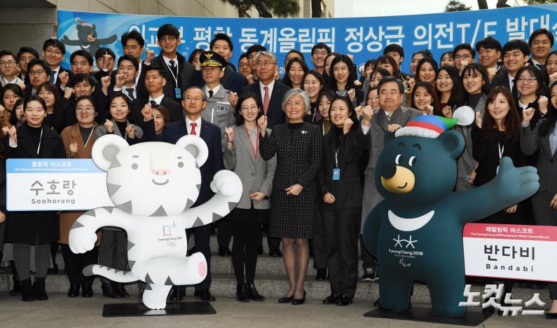 8일 오전 서울 종로구 외교부청사에서 열린 '평창 동계올림픽 정상급 의전 T/F 발대식' 에서 강경화 외교부 장관을 비롯한 참석자들이 기념촬영을 하고 있다.
