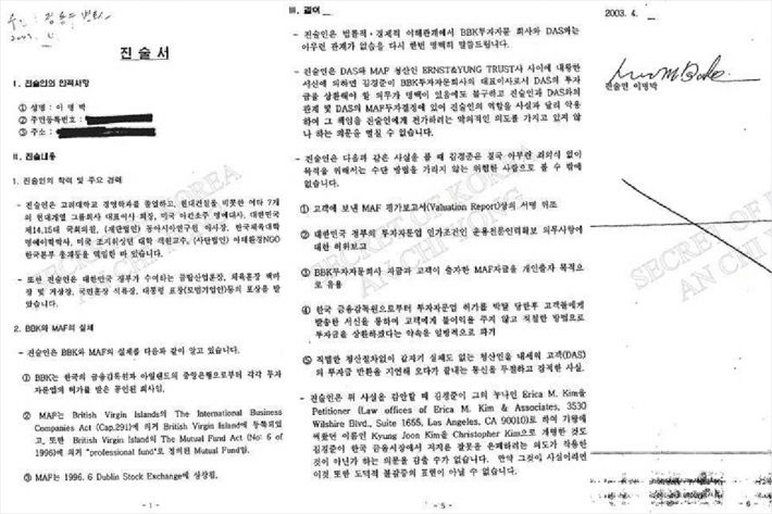 이 자료는 이 전 대통령이 김경준 전 BBK투자자문 대표와 민사소송을 벌이던 중 미국 법원에 제출하기 위해 2003년 4월에 작성된 총 6장 분량의 진술서 전문이다. 마지막 장에는 이 전 대통령의 자필 서명도 담겼다.