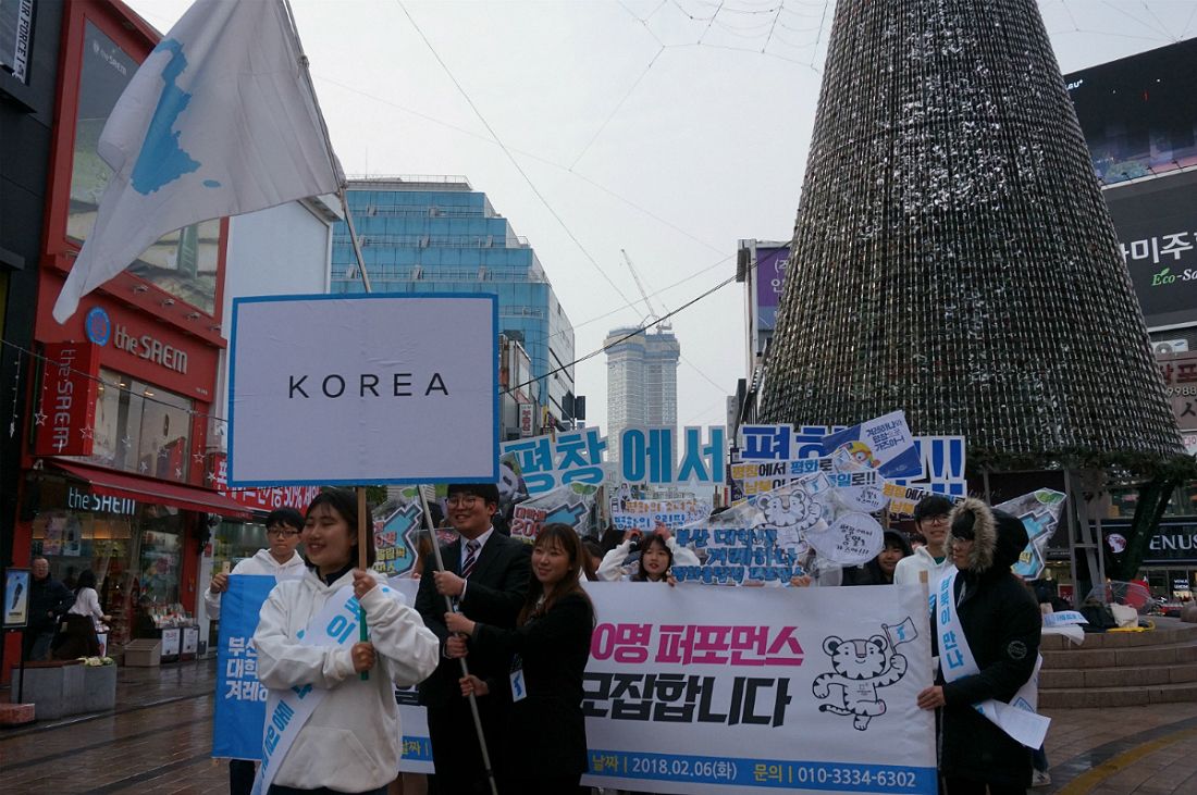 부산대학생겨레하나는 22일 오후 2시 부산 중구 남포동 시티스폿 앞에서 기자회견을 열고 다음 달 6일 '평화올림픽 기원 대학생 퍼포먼스'를 열 계획이라며 여기에 참가할 대학생 200명을 모집한다고 밝혔다.