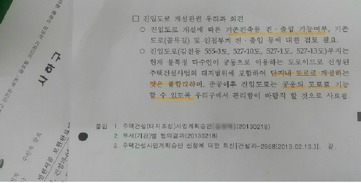 공문에는 또 문제의 진입도로는 '불특정 다수인이 공동으로 이용하고 있어 아파트 사업부지 도로로 개설하는 것은 불합리하다'는 지적을 포함하고 있다.