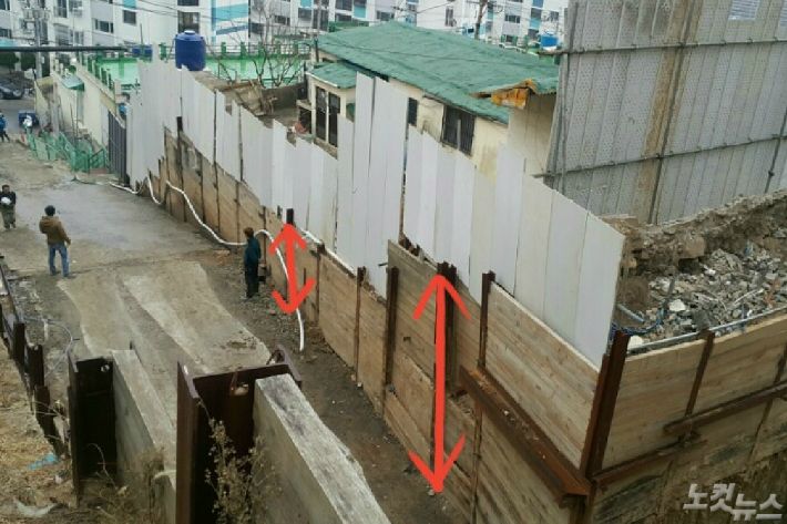 신태양건설이 부산 사하구에서 진행 중인 아파트 신축으로 도로가 2~3m 낮아져(빨간 화살표 부분) 기존 주택이 절벽 위에 놓이게 되고, 이로 인해 출입도로를 사용하지 못하고 있다. (사진=부산CBS 강민정 기자)