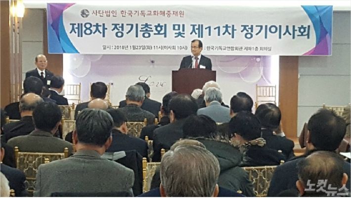 사단법인 한국기독교화해중재원이 23일 제8차 정기총회를 열어 피영민 이사장(중앙)이 의장석에서 총회를 진행하고 유재수 대외협력처장이 진행과정을 설명하는 모습(왼쪽).