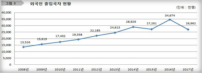 법무부는 "외국인 출입국자는 2012년 처음 2000만명을 넘어선 이후, 2016년 3400만명을 돌파해 사상 최고를 기록했다"며 "그러나 2017년에는 사드 여파로 인해 중국인 관광객이 급감해 2015년 수준(2726만명)으로 크게 감소했다"고 밝혔다.