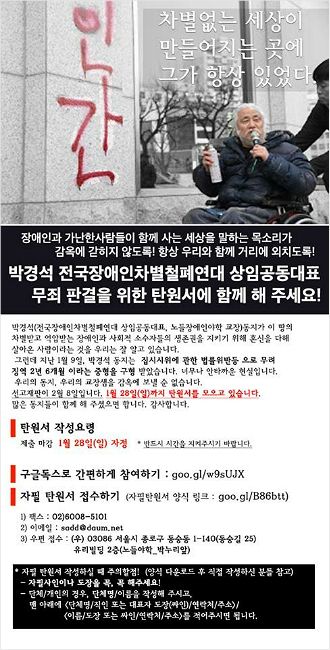 ◆ 박경석> 이제 아까 이야기했던 고속버스에 4월 20일 저희가 장애인의 날이라고 그러는데 그날 이제 이 고속버스터미널에 가서 타려고 했다가 경찰들이 막으면서 최루액을 뿌리게 됐어요. 그래서 최루액 맞으면서 타려고 했는데 그게 이제 좀 마찰이 있어서 집시법 위반이 됐고요. 또 하나는 이제 제가 명동성당을 찾아갔어요. 그때가 교황 오셨을 때입니다. 그런데 이제 세월호 문제도 이야기하시고 그러면서 장애인 문제 이야기하시면서 어디 가셨는고 하니 꽃동네를 가셨어요. 그런데 우리는 꽃동네는 장애인을 수용하는 수용시설이기 때문에 그렇게 가시지 말고 지역사회에서 함께 살아갈 수 있는 이런 메시지를 주십사 하고 교황님께서 꽃동네 가는 것들을 반대하면서 명동성당에 서한문을 전달하러 갔어요. 그런데 막았어요. 막아서 그냥 들어갔더니 이게 주거침입이 된 거죠. 들어가면서 이제 조금 마찰이 있어서 이제 재물손괴가 돼서 이게 이제 또 재판의 이유가 됐고요. 또 하나는 이제 일반 교통방해인데요. 그때 8월 15일 아마 세월호 때문에 대회가 있었는데 그때 참여했다가 그때 모든 사람들이 도로로 행진하고 막 이랬었어요. 그게 이제 도로 집시법 위반 이렇게 돼서.