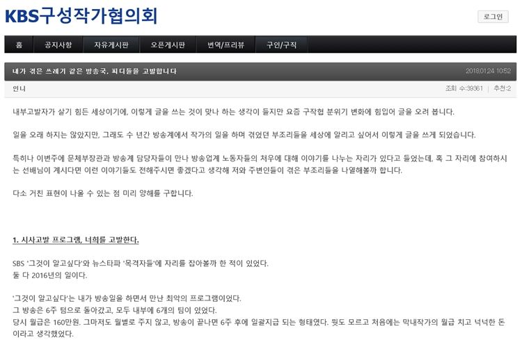 KBS 구성작가협의회 자유게시판에 '인니'라는 글쓴이는 '내가 겪은 쓰레기 같은 방송국, 피디들을 고발합니다'라는 글을 24일 오전에 올렸다. "얼마든지 다른 곳에 퍼가셔도 좋다. 널리 알려질수록 좋은 것 같다"고 한 이 글은 27일 오전 현재 39376회 읽히며 폭발적인 반응을 얻고 있다.