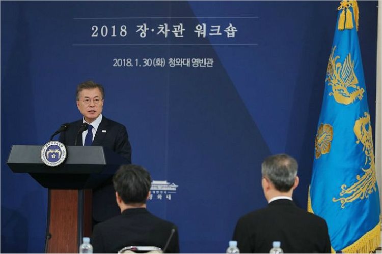 문재인 대통령이 30일 청와대 영빈관에서 주재한 장차관 워크숍에서 모두발언을 하고 있다. /청와대 제공