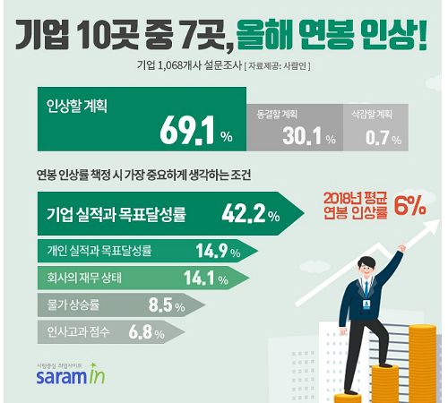 기업 10곳 중 7곳이 올해 직원들의 연봉을 인상할 계획인 것으로 조사됐다. 연봉 인상률은 평균 6%로 집계됐다.