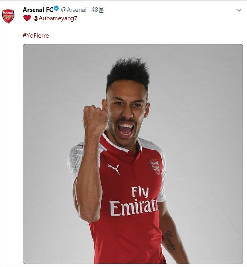 잉글랜드 프리미어리그 아스널은 치열한 영입 경쟁을 뚫고 도르트문트 공격수 피에르 에메릭 오바메양의 영입을 확정했다.(사진=아스널 공식 트위터 갈무리)