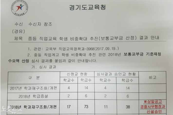 삼일공고의 '경찰사무행정과' 신설 관련 요청에 대해 교육부가 지난해 9월 신설승인(비고란의 빨간색) 한 공문.(사진=신병근 기자)