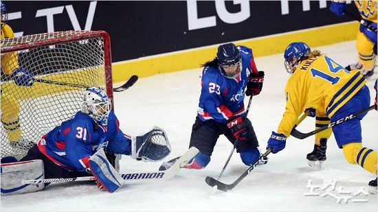 한국 여자 아이스하키의 주전 골리 신소정은 남북 단일팀에서도 주전의 입지를 확실하게 굳혔다. 비록 스웨덴과 평가전에서 3실점했지만 여전한 선방쇼를 펼쳤다.(사진공동취재단)