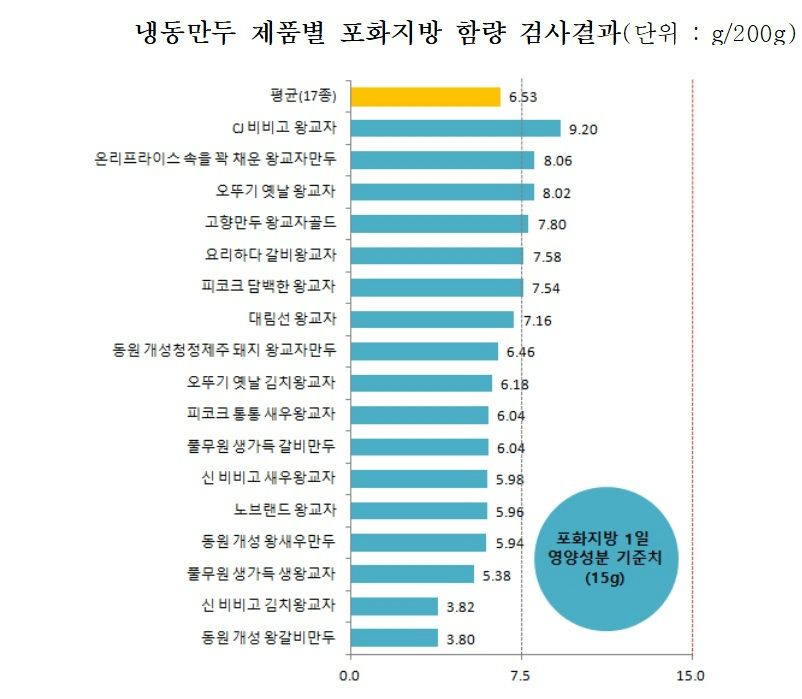 냉동만두 17개 제품의 200g당(만두 5~6개) 평균 포화지방 함량은 6.53g으로 1일 영양성분기준치(15g)의 44%, 평균 나트륨 함량은 658.48mg으로 1일 영양성분기준치(2,000mg)의 33% 수준이었다.