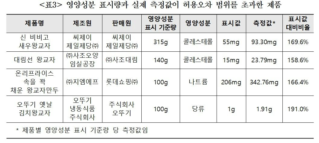 '신 비비고 새우왕교자'와 '대림선 왕교자'는 콜레스테롤이, '오뚜기 옛날 김치왕교자'는 당류 함량이 허용오차 범위를 넘었고, 롯데마트 PB브랜드인 '온리프라이스 속을 꽉 채운 왕교자만두'는 나트륨 함량이 표시기준에서 정한 허용오차 범위를 넘었다.