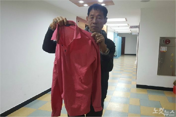 심재호 여수 개인택시 기사가 부실한 제복이라며 면티를 들어보이고 있다 (사진=고영호 기자)