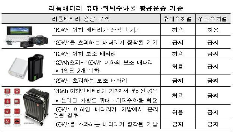 먼저 160Wh(와트시) 이하 리튬배터리가 장착된 기기는 휴대·위탁수하물 모두 허용된다. 160Wh를 초과하는 배터리 장착 기기는 휴대·위탁수하물 모두 금지된다.