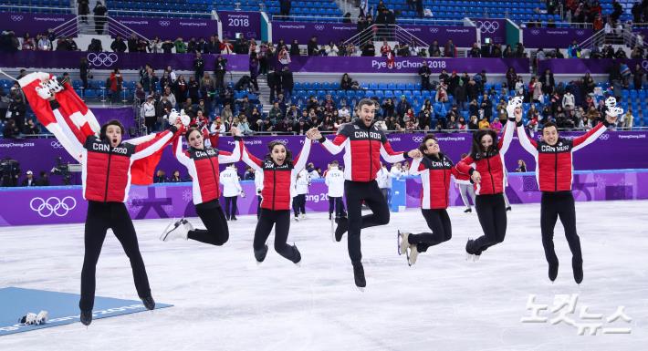 12일 오후 강원도 강릉 강릉아이스아레나에서 피겨스케이팅 팀이벤트에서 1위를 한 캐나다 선수들이 점프를 하며 기념사진을 찍고 있다.