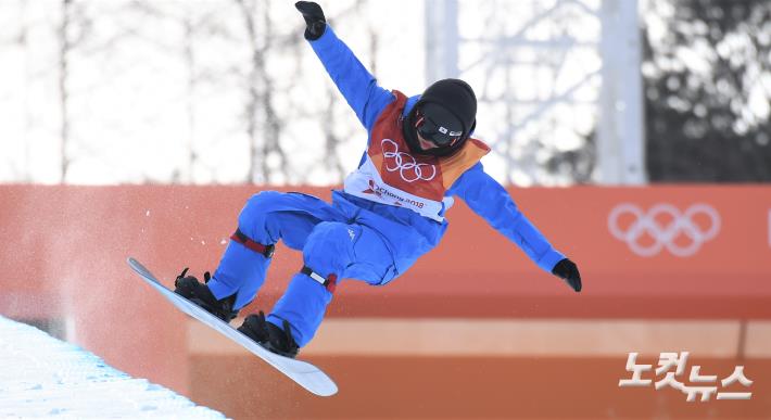 12일 오후 강원도 평창군 휘닉스 스노 경기장에서 열린 평창동계올림픽 스노보드 여자 하프파이프 예선 경기에서 한국 권선우가 공중 기술을 선보이고 있다.