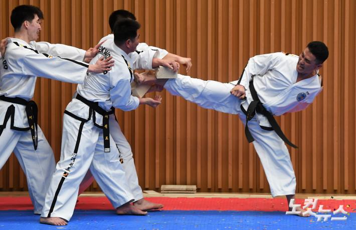태권도 WT(남,세계태권도연맹)와 ITF(북,국제태권도연맹) 시범단이 12일 오후 서울 시청 다목적홀에서 열린 남- 북 태권도 합동 시범 공연에서 북한 선수가 8cm 송판을 발차기로 격파 하고 있다.