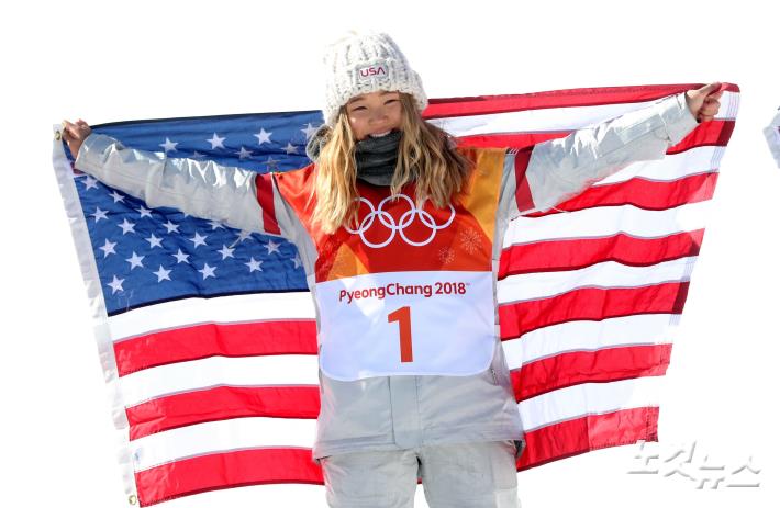 13일 강원도 평창 휘닉스 스노 경기장에서 열린 2018 평창동계올림픽 스노보드 여자 하프파이프 결선에서 금메달을 차지한 클로이 킴(미국)이 기뻐하고 있다.