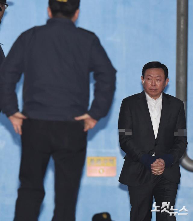 ‘최순실 게이트’ 연루 혐의로 재판에 넘겨져 1심 선고공판에서 징역 2년 6개월과 추징금 70억원을 선고받고 법정구속 된 신동빈 롯데그룹 회장이 13일 오후 서울 서초구 중앙지법을 나서고 있다.