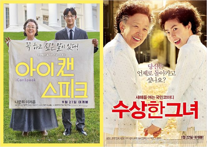 최근 5년 간 여성 주연의 상업영화 중 최대 스크린 수 약 1,000개 이상인 영화 4편 중 2편인 '수상한 그녀'와 '아이 캔 스피크'의 포스터.