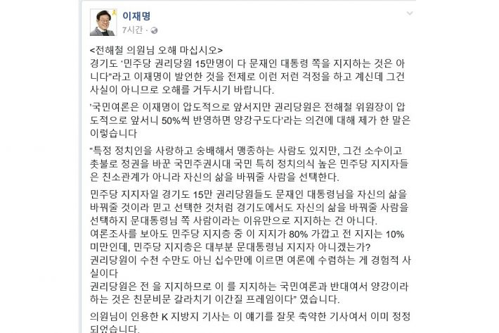 이 시장은 이날 페이스북에 '전해철 의원님 오해 마십시오'라는 글을 올려 "경기도 '민주당 권리당원 15만명이 다 문재인 대통령을 지지하는 것은 아니다'고 이재명이 발언한 것을 전제로 이런저런 걱정을 하고 계시는데, 그건 사실이 아니므로 오해를 거두시기 바란다"고 했다.