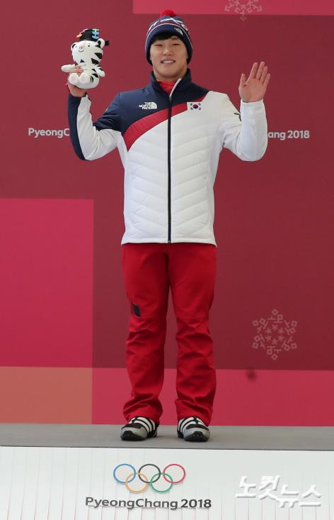 스켈레톤 금메달을 획득한 윤성빈이 16일 강원도 평창군 올림픽 슬라이딩센터에서 열린 '2018 평창동계올림픽' 4차 주행을 마친 뒤 시상식에서 기념촬영을 갖고 있다.