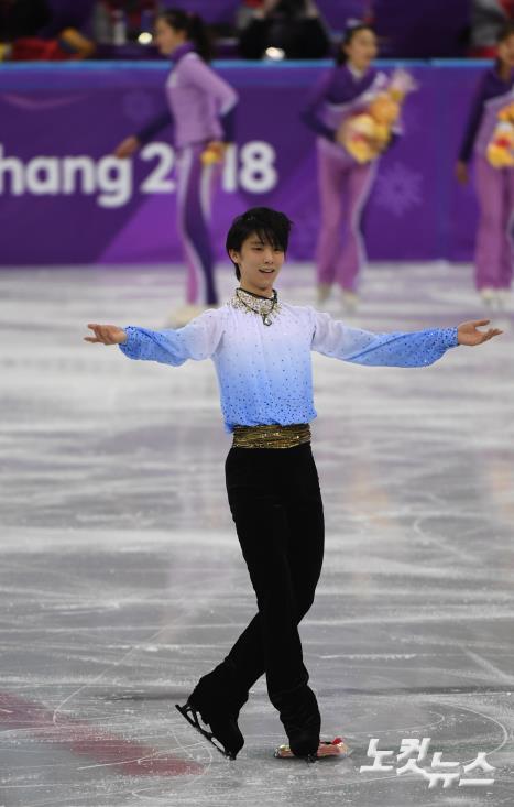 16일 강릉아이스아레나에서 열린 2018 평창동계올림픽 피겨스케이팅 남자 싱글 쇼트 프로그램에서 일본 하뉴 유즈루가 연기 후 인사하고 있다.
