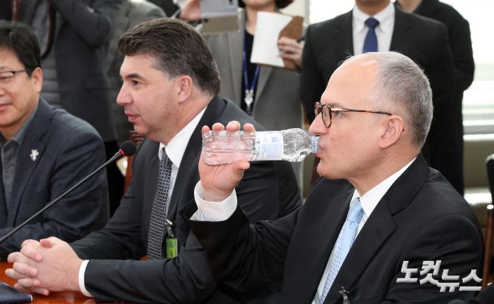 배리 앵글 GM 총괄부사장 겸 해외사업부문(GM International) 사장과 카허 카젬 한국GM 사장이 20일 더불어민주당 한국GM 대책 TF, 국회 환경노동위 소속 의원들과 논의를 위해 서울 여의도 더불어민주당 원내대표 회의실에 앉아있다.