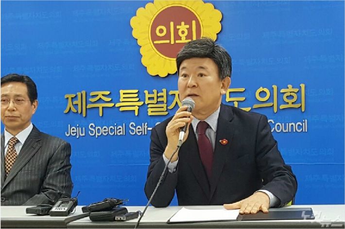 21일 제주도의회 도민의방에서 출마 기자회견 중인 김광수 제주도의회 교육의원 (사진=문준영 기자)