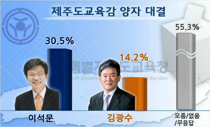 이 교육감에 대한 선호도는 30.5%로 김광수 현 제주도의회 교육의원에 대한 선호도 14.2%에 비해 두 배 이상 높게 나타났다.