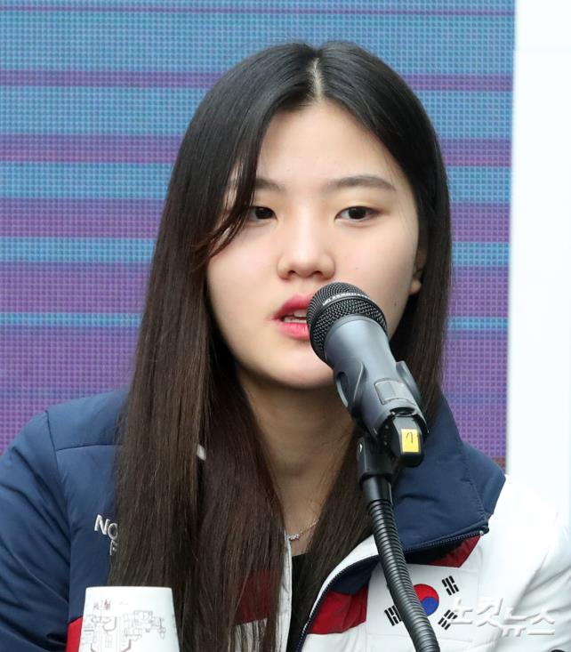 이유빈이 23일 오전 강원도 강릉 올림픽파크 내 코리아하우스에서 열린 '2018 평창동계올림픽 대한민국 여자 쇼트트랙 대표팀 기자회견'에서 취재진의 질문에 답하고 있다.