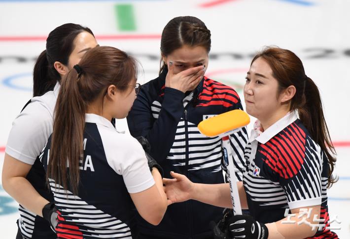 23일 오후 강원 강릉컬링센터에서 열린 2018평창동계올림픽 여자 컬링 준결승전 대한민국과 일본의 경기에서 일본을 8-7로 승리한 대한민국 김은정이 눈물을 흘리고 있다.