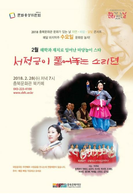 이번 공연은 마당놀이 스타인 서정금이 풀어놓은 소리뎐으로 판소리 5바탕 중 유명스럽고 해학적인 대목만을 골라 마당극판을 벌일 예정이다.