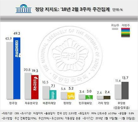 ◆ 이택수> 민주당을 제외하고는 야4당이 모두 하락했는데요. 민주당은 지난주 대비 3.4%포인트 오른 49.3%를 기록했고요. 한국당은 1.5%포인트 하락한 19.3%. 바른미래당은 3.4%포인트 빠진 7.1%. 정의당이 0.4% 빠진 5.2%. 민평당이 0.4%포인트 빠진 3%를 기록했습니다.