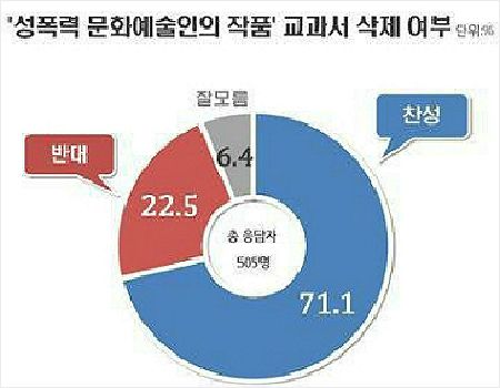◆ 이택수> 저희가 지난 금요일 23일날 전국 성인 9,099명이 접속을 해서 최종 505명이 완료했습니다. 5.6%의 응답률. 유무선 자동응답 혼용 방식이었고요. 표본오차는 95% 신뢰 수준에서 플러스, 마이너스 4.4%포인트였습니다. 질문은 다음과 같았는데요. 최근 시인 고은, 연출가 이은택 씨 등 성폭력 문제로 논란이 되고 있는 인물들의 작품을 교과서에서 삭제해야 한다는 의견이 제기되고 있습니다. 선생님께서는 이 의견에 대해서 어떻게 생각하십니까, 이렇게 물었습니다. 1번 성폭력 의혹 인물의 작품을 가르쳐서는 안 되기에 교과서에서 삭제해야 한다.