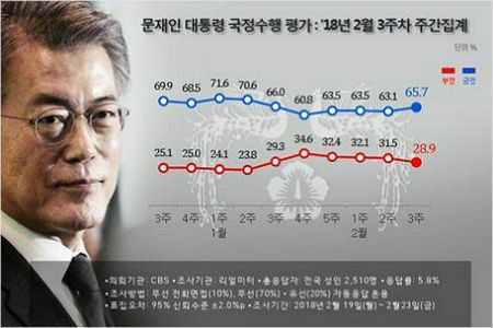 ◆ 이택수> 5주 만에 60% 중반을 기록하게 됐습니다. 그간 한 4주가량 60% 초중반으로 그 전에 비해서 소폭 하락한 모습이 계속 유지가 됐었는데 올림픽 막바지에 가면서 문재인 대통령의 지지율이 60% 중반 이상으로 올랐고요. 부정평가도 5주 만에 28.9%로 20%대로 떨어졌습니다.
