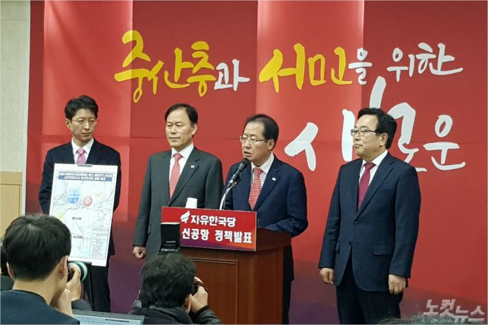 홍준표 자유한국당 대표가 27일 신공항대책을 발표하고 있다. (경남CBS 이상현 기자)